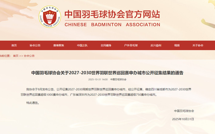 今年9月,中国羽协发布公告,公开赛征集2027-2030周期世界羽联世界巡回赛申办城市。经公开征集,中国羽协10月31日发布公告,确定四川省成都市为2027-2030世界羽联世界巡回赛超级1000赛申办城市,广东省深圳市为2027-2030世界羽联世界巡回赛超级750赛申办城市。