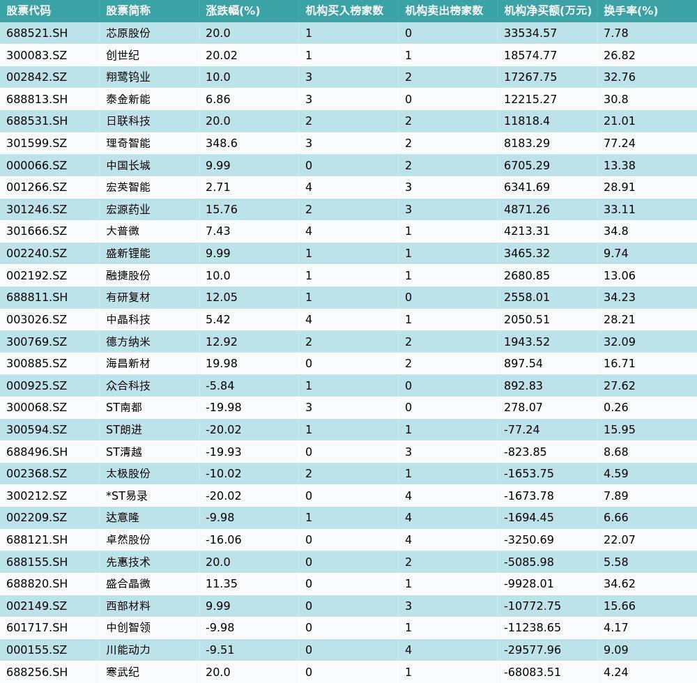 南财智讯4月30日电,盘后数据显示,因当日异动登上龙虎榜的个股中配资门户网,30只沪深A股龙虎榜出现了机构的身影,机构合计净卖出5368.37万元,具体来看,机构净买入18只个股,净卖出12只个股。其中,机构净买入前三分别为芯原股份(688521.SH)、创世纪(300083.SZ)与翔鹭钨业(002842.SZ),详情见下图:机构净卖出的个股中,前三分别为寒武纪(688256.SH)、川能动力(000155.SZ)与中创智领(601717.SH)。