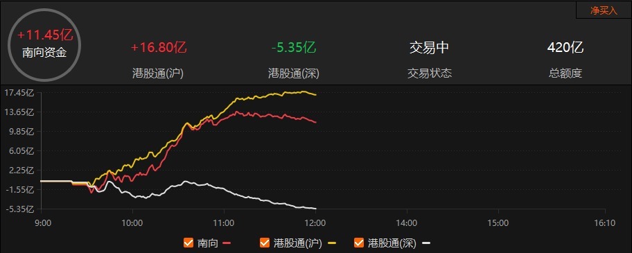 南向资金方面,南向资金早盘净买入11.45亿港元。