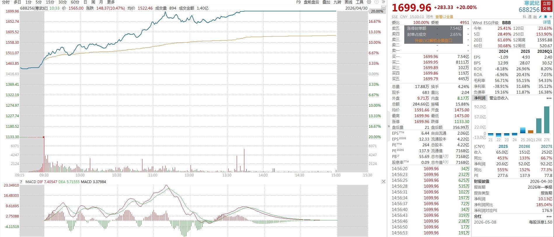 寒武纪今日20cm涨停,成交额284.66亿元,换手率4.24%,盘后龙虎榜数据显示,沪股通专用席位买入34.38亿元并卖出17.57亿元,有1家机构专用席位净卖出6.81亿元。国泰海通总部净买入10.42亿元。